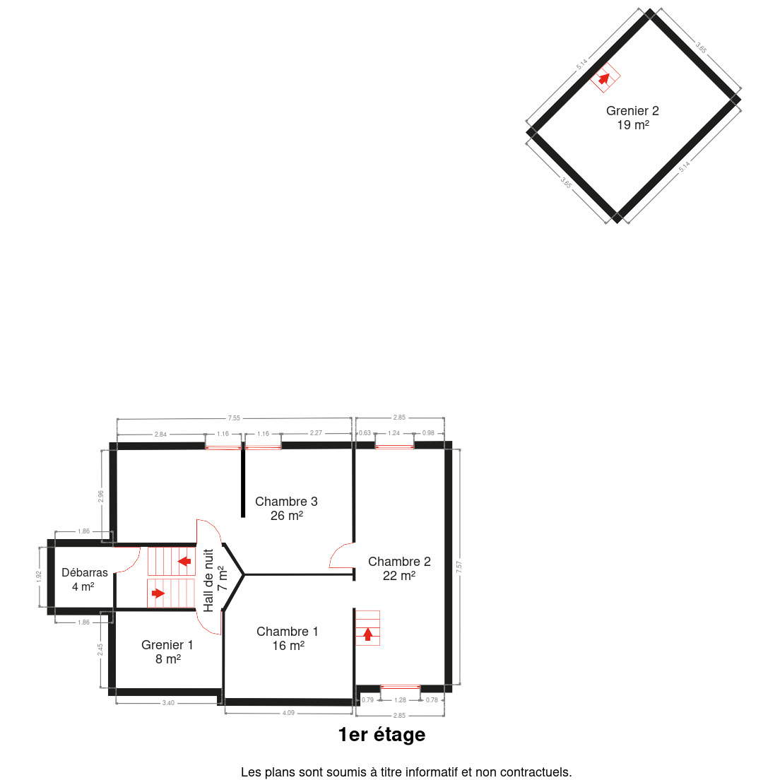 À l’étage, le hall de nuit dessert quatre chambres, offrant de nombreuses possibilités d’aménagement.