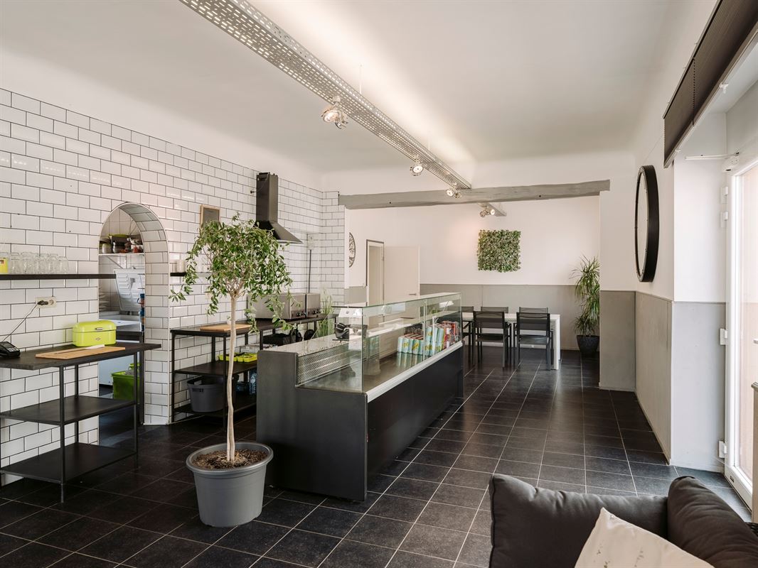 Le rez-de-chaussée développe un espace commercial spacieux et lumineux, actuellement aménagé avec une zone de comptoir et un espace de restauration avec plusieurs tables permettant d’accueillir la clientèle dans un cadre moderne et convivial.
